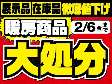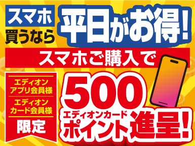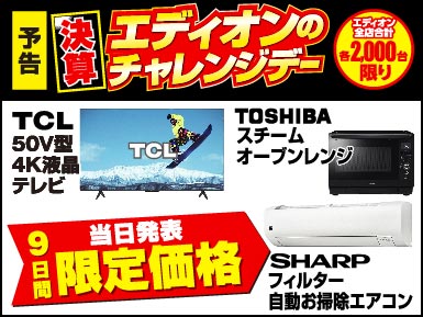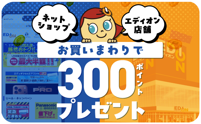SALE ALL #ネット通販 #家電 #スマホ・PC #リフォーム #ゲーム玩具 #日用品 #応募・その他 【訳あり商品】台数限定特価にて大放出! 当社指定エアコンを3台以上同時購入で指定の一台が最大半額! お持ちのエディオンポイントで生活用品を購入しませんか? 【ハッピーアニバーサリー】応募でもれなく200ポイントプレゼント! エアコンを買い換えるなら、今? 知っておきたい 2027年問題 ご注意ください! 2027年 蛍光灯が生産終了します! 【11/14~2026/3/31】バンプラ組んでみたキャンペーン 【12/12~3/31】太陽光発電システム ご相談承ります! 【12/12~3/31】太陽光発電をお使いの方へ 蓄電システム ご相談承ります! 【12/12~3/5】ぽこあポケモン オンライン予約開始! 【12/19~2/28】スマホ・タブレット全品 増額買取実施中! 【1/1~2/27】備えあれば憂いなし!防災対策特集! エディオン×USJ キッズシールを集めちゃおう! ひとり暮らしの4STEP!!【新生活】 家電パックが楽ちん!お得!【新生活】 冬の健康対策は湿度が重要! 髪・肌のお悩みに合わせて美容家電をご紹介♪ パソコンを買うなら今!値上げ前にお買い逃しなく! 【2/19まで】2026 お家快適リフォームフェア! 【1/19~3/31】平日限定 スマホご購入でエディオンポイント500ポイント進... 【2/7~2/8】2日間限定!豪華景品が当たる!お楽しみ大抽選会 【1/23~3/31】e angleドラム式洗濯乾燥機 デビューフェア価格! 【1/24~2/6】いろんなお悩みを相談!パソコン買い替え相談会 【1/23~2/28】給湯器を10年以上お使いの方は早めの買替えを! 【2/15まで】アプリでもっとお得に!決算還元 リフォームチラシ! 【1/31~2/27】お家の中を快適に!花粉・ウィルス対策特集! 【1/31~2/15】e angle Week とてもお得な16日間! 【2/19まで】リフォーム決算セールチラシ!特別価格で大奉仕! 【2/15まで】エアコン標準取付工事費 全額値引き!今週の特価品はこちら! 【1/31~2/6】暖房商品大処分セール! 【1/31~2/13】富士通パソコンがお得なエディオンパソコンWEEK! 予告【2/7~2/15】8週連続 エディオンチャレンジー 第2弾! おすすめ情報 エディオンでエアコンを買う理由をお伝えします エディオンのサービス紹介 実は高級ウォッチもあるんです!(15店舗で取扱) これを見れば安心して家電選びができる イベントやプレゼント企画を続々開催 販売員目線のおすすめプレゼントも掲載中 お得なアイテムやアウトレット商品まで一挙大放出 中古販売・買取できる店舗 お得なメーカーキャンペーン集めました!お見逃しなく iPhone 17 ご購入はこちらから ゲームソフト・ゲーム機高価買取中 大型家電の故障は家電の119番 訪問修理窓口をご利用ください エディオン家電総合マガジン 2025年12月-2026年2月号 200コインで1口応募 GODIVA チョコレート(15粒入) 25名様 店舗でもネットでも、保証で安心!ポイントでおトク! 店舗・チラシ検索 近くのエディオンを見つけよう 検索 手軽にネットでご注文 エディオンネットショップ エディオンネットショップへ ポイントがおトク! 充実保証! スピード配達! プロのご提案! あれも、これも、欲しいが見つかる 選べる!アプリ会員&カード会員 修理・サービスの専門スタッフで安心 修理・サービス クリーニング プロの技で徹底洗浄 パソコンサポート 出張費込みのサポートパック 修理 受付から修理完了までワンストップ! 電機工事 エアコン・アンテナ、工事全般承ります もっと見る リフォームも気軽にご相談 エディオンリフォーム 選ばれる理由 もっと見る 有名メーカーから選べる豊富なラインナップ もっと見る もっと見る PICK UP 戻る 次へ