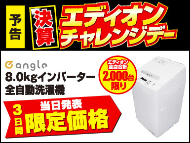SALE ALL #ネット通販 #家電 #スマホ・PC #リフォーム #ゲーム玩具 #日用品 #応募・その他 【訳あり商品】台数限定特価にて大放出! 当社指定エアコンを3台以上同時購入で指定の一台が最大半額! お持ちのエディオンポイントで生活用品を購入しませんか? 【ハッピーアニバーサリー】応募でもれなく200ポイントプレゼント! エアコンを買い換えるなら、今? 知っておきたい 2027年問題 ご注意ください! 2027年 蛍光灯が生産終了します! 【11/14~2026/3/31】バンプラ組んでみたキャンペーン 【12/12~3/31】太陽光発電システム ご相談承ります! 【12/12~3/31】太陽光発電をお使いの方へ 蓄電システム ご相談承ります! 【12/12~3/5】ぽこあポケモン オンライン予約開始! 【12/19~2/28】スマホ・タブレット全品 増額買取実施中! 【1/1~2/27】備えあれば憂いなし!防災対策特集! エディオン×USJ キッズシールを集めちゃおう! ひとり暮らしの4SETP!!【新生活】 家電パックが楽ちん!お得!【新生活】 冬の健康対策は湿度が重要! 髪・肌のお悩みに合わせて美容家電をご紹介♪ パソコンを買うなら今!値上げ前にお買い逃しなく! 【1/24~1/25】2日間限定!豪華景品が当たる!お楽しみ大抽選会 【2/19まで】2026 お家快適リフォームフェア! 【1/17~1/23】この冬も大活躍!エアコンを買い替えるなら今! 【黄砂・ウイルス対策】1月19日は空気清浄機の日! 【1/17~1/23】暖房商品大処分セール! 【1/17~1/30】エディオンパソコンWEEK!NECのノートPCがお得に! おすすめ情報 エディオンでエアコンを買う理由をお伝えします エディオンのサービス紹介 実は高級ウォッチもあるんです!(15店舗で取扱) これを見れば安心して家電選びができる イベントやプレゼント企画を続々開催 販売員目線のおすすめプレゼントも掲載中 お得なアイテムやアウトレット商品まで一挙大放出 中古販売・買取できる店舗 お得なメーカーキャンペーン集めました!お見逃しなく iPhone 17 ご購入はこちらから ゲームソフト・ゲーム機高価買取中 大型家電の故障は家電の119番 訪問修理窓口をご利用ください エディオン家電総合マガジン 2025年12月-2026年2月号 100コインで1口応募 新春グルメ 大盤振る舞いキャンペーン 店舗でもネットでも、保証で安心!ポイントでおトク! 店舗・チラシ検索 近くのエディオンを見つけよう 検索 手軽にネットでご注文 エディオンネットショップ エディオンネットショップへ ポイントがおトク! 充実保証! スピード配達! プロのご提案! あれも、これも、欲しいが見つかる 選べる!アプリ会員&カード会員 修理・サービスの専門スタッフで安心 修理・サービス クリーニング プロの技で徹底洗浄 パソコンサポート 出張費込みのサポートパック 修理 受付から修理完了までワンストップ! 電機工事 エアコン・アンテナ、工事全般承ります もっと見る リフォームも気軽にご相談 エディオンリフォーム 選ばれる理由 もっと見る 有名メーカーから選べる豊富なラインナップ もっと見る もっと見る PICK UP 戻る 次へ