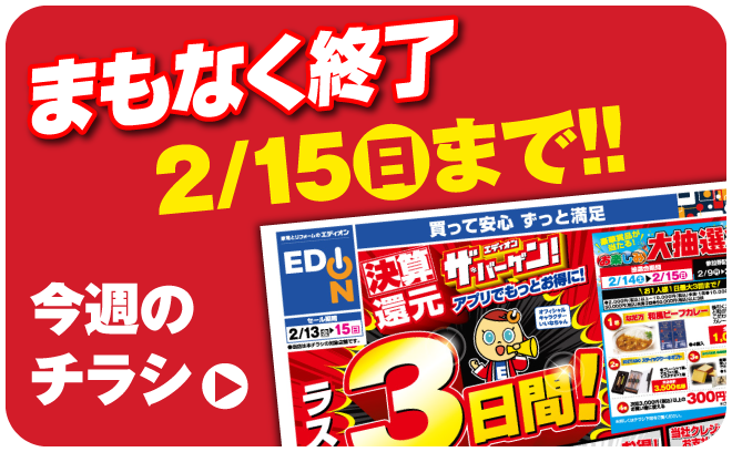 SALE ALL #ネット通販 #家電 #スマホ・PC #リフォーム #ゲーム玩具 #日用品 #応募・その他 【訳あり商品】台数限定特価にて大放出! 当社指定エアコンを3台以上同時購入で指定の一台が最大半額! お持ちのエディオンポイントで生活用品を購入しませんか? エアコンを買い換えるなら、今? 知っておきたい 2027年問題 ご注意ください! 2027年 蛍光灯が生産終了します! 【11/14~2026/3/31】バンプラ組んでみたキャンペーン 【12/12~3/31】太陽光発電システム ご相談承ります! 【12/12~3/31】太陽光発電をお使いの方へ 蓄電システム ご相談承ります! 【12/12~3/5】ぽこあポケモン オンライン予約開始! 【12/19~2/28】スマホ・タブレット全品 増額買取実施中! 【1/1~2/27】備えあれば憂いなし!防災対策特集! エディオン×USJ キッズシールを集めちゃおう! ひとり暮らしの4STEP!!【新生活】 家電パックが楽ちん!お得!【新生活】 冬の健康対策は湿度が重要! 髪・肌のお悩みに合わせて美容家電をご紹介♪ パソコンを買うなら今!値上げ前にお買い逃しなく! 【2/19まで】2026 お家快適リフォームフェア! 【1/19~3/31】平日限定 スマホご購入でエディオンポイント500ポイント進... 【1/23~3/31】e angleドラム式洗濯乾燥機 デビューフェア価格! 【1/23~2/28】給湯器を10年以上お使いの方は早めの買替えを! 【2/15まで】アプリでもっとお得に!決算還元 リフォームチラシ! 【1/31~2/27】お家の中を快適に!花粉・ウィルス対策特集! 【1/31~2/15】e angle Week とてもお得な16日間! 【2/19まで】リフォーム決算セールチラシ!特別価格で大奉仕! 【2/7~2/15】8週連続 エディオンチャレンジー 第2弾! 【2/6~2/23】パナソニック 炊飯ジャー プライスダウン! 【2/7~2/15】テレビがお得な9日間! 【2/7~2/15】洗濯機買い替えのチャンス!アンケートに答えて最大30,000... 【2/13から】パナソニック 冷蔵庫&洗濯機がお求めやすくなります! 【65歳以上の方限定!】10,000円以上のお買い物で使えるシニア割クーポン配信... 【3/31まで】エディオン限定!ドコモの折りたたみ携帯からスマホへの買い換えでお... おすすめ情報 エディオンでエアコンを買う理由をお伝えします エディオンのサービス紹介 実は高級ウォッチもあるんです!(15店舗で取扱) これを見れば安心して家電選びができる イベントやプレゼント企画を続々開催 販売員目線のおすすめプレゼントも掲載中 お得なアイテムやアウトレット商品まで一挙大放出 中古販売・買取できる店舗 お得なメーカーキャンペーン集めました!お見逃しなく iPhone 17 ご購入はこちらから ゲームソフト・ゲーム機高価買取中 大型家電の故障は家電の119番 訪問修理窓口をご利用ください エディオン家電総合マガジン 2025年12月-2026年2月号 200コインで1口応募 GODIVA チョコレート(15粒入) 25名様 店舗でもネットでも、保証で安心!ポイントでおトク! 店舗・チラシ検索 近くのエディオンを見つけよう 検索 手軽にネットでご注文 エディオンネットショップ エディオンネットショップへ ポイントがおトク! 充実保証! スピード配達! プロのご提案! あれも、これも、欲しいが見つかる 選べる!アプリ会員&カード会員 修理・サービスの専門スタッフで安心 修理・サービス クリーニング プロの技で徹底洗浄 パソコンサポート 出張費込みのサポートパック 修理 受付から修理完了までワンストップ! 電機工事 エアコン・アンテナ、工事全般承ります もっと見る リフォームも気軽にご相談 エディオンリフォーム 選ばれる理由 もっと見る 有名メーカーから選べる豊富なラインナップ もっと見る もっと見る PICK UP 戻る 次へ