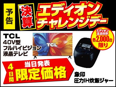 SALE ALL #ネット通販 #家電 #スマホ・PC #リフォーム #ゲーム玩具 #日用品 #応募・その他 【訳あり商品】台数限定特価にて大放出! 当社指定エアコンを3台以上同時購入で指定の一台が最大半額! お持ちのエディオンポイントで生活用品を購入しませんか? 【ハッピーアニバーサリー】応募でもれなく200ポイントプレゼント! エアコンを買い換えるなら、今? 知っておきたい 2027年問題 ご注意ください! 2027年 蛍光灯が生産終了します! 【11/14~2026/3/31】バンプラ組んでみたキャンペーン 【12/12~3/31】太陽光発電システム ご相談承ります! 【12/12~3/31】太陽光発電をお使いの方へ 蓄電システム ご相談承ります! エディオン×USJ キッズシールを集めちゃおう! ひとり暮らしの4STEP!!【新生活】 家電パックが楽ちん!お得!【新生活】 冬の健康対策は湿度が重要! 髪・肌のお悩みに合わせて美容家電をご紹介♪ 【1/19~3/31】平日限定 スマホご購入でエディオンポイント500ポイント進... 【1/23~3/31】e angleドラム式洗濯乾燥機 デビューフェア価格! 【3/31まで】エディオン限定!ドコモの折りたたみ携帯からスマホへの買い換えでお... 【2/20~3/31】決算クリーニングキャンペーン レシートに当たりが出たら1等全額キャッシュバック!2026/2/20~3/31 【3/31まで】決算還元!特別ご招待会 リフォーム決算チラシ! 【2/20~3/31】ANKERフェア開催!まとめ買いがお得! 最新キッチン・バスにリフォームで大変身! 【3/31まで】決算一押し!LIXIL トイレフェア! 【3/31まで】Surface U25 新生活応援モデル 発売中! Microsoft365なら便利な機能が盛り沢山! 均一特価・日用品チラシ 【3/31まで】エコキュート補助金 最大10万円!今が給湯器買替えのチャンス! 【3/1~3/31】Panasonic ファインバブルシャワーヘッドがお得! 【3/31まで】ダイキン エコキュートフェア! 【3/7~3/31】新生活応援 家電フェアチラシ 【3/7~4/12】アンパンマン 春のおもちゃフェスティバル! 【3/28~3/29】2日間限定!豪華景品が当たる!決算お楽しみ大抽選会 【3/14~3/31】NECパソコンがお得なエディオンパソコンWEEK! 【3/20~5/6】レゴ製品ご購入で人気のレゴブロックが30名様に当たる! 【3/20~4/5】人気のおもちゃ・ゲームが盛りだくさん!タカラトミーフェア 【3/20~4/3】いろんなお悩みを解決!パソコン買い替え相談会 【3/20~3/31】冷蔵庫・洗濯機買い替え応援セール! 予告【3/28~3/31】8週連続 エディオンチャレンジデー 第8弾! 【3/27まで】エアコン旧モデルがお買い得!決算売りつくし! おすすめ情報 エディオンでエアコンを買う理由をお伝えします エディオンのサービス紹介 実は高級ウォッチもあるんです!(15店舗で取扱) これを見れば安心して家電選びができる イベントやプレゼント企画を続々開催 販売員目線のおすすめプレゼントも掲載中 お得なアイテムやアウトレット商品まで一挙大放出 中古販売・買取できる店舗 お得なメーカーキャンペーン集めました!お見逃しなく iPhone 17 ご購入はこちらから ゲームソフト・ゲーム機高価買取中 大型家電の故障は家電の119番 訪問修理窓口をご利用ください エディオン家電総合マガジン 2026年3-5月号 店舗でもネットでも、保証で安心!ポイントでおトク! 店舗・チラシ検索 近くのエディオンを見つけよう 検索 手軽にネットでご注文 エディオンネットショップ エディオンネットショップへ ポイントがおトク! 充実保証! スピード配達! プロのご提案! あれも、これも、欲しいが見つかる 選べる!アプリ会員&カード会員 修理・サービスの専門スタッフで安心 修理・サービス クリーニング プロの技で徹底洗浄 パソコンサポート 出張費込みのサポートパック 修理 受付から修理完了までワンストップ! 電機工事 エアコン・アンテナ、工事全般承ります もっと見る リフォームも気軽にご相談 エディオンリフォーム 選ばれる理由 もっと見る 有名メーカーから選べる豊富なラインナップ もっと見る もっと見る PICK UP 戻る 次へ