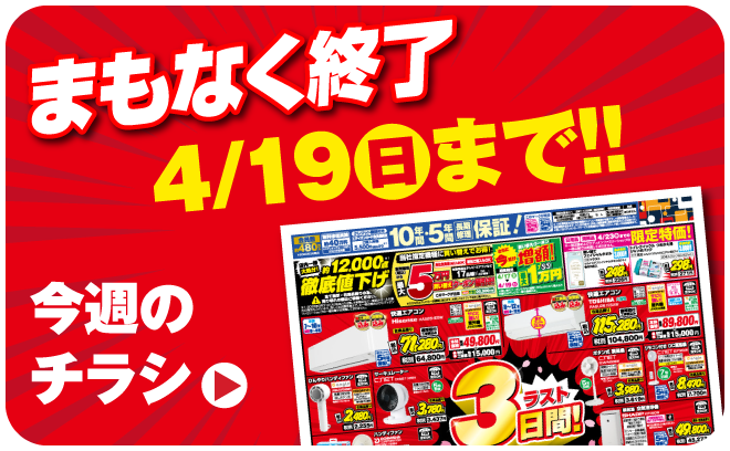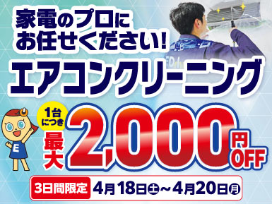 SALE ALL #ネット通販 #家電 #スマホ・PC #リフォーム #ゲーム玩具 #日用品 #応募・その他 【訳あり商品】台数限定特価にて大放出! 当社指定エアコンを3台以上同時購入で指定の一台が最大半額! お持ちのエディオンポイントで生活用品を購入しませんか? エアコンを買い換えるなら、今? 知っておきたい 2027年問題 ご注意ください! 2027年 蛍光灯が生産終了します! ひとり暮らしの4STEP!!【新生活】 家電パックが楽ちん!お得!【新生活】 最新キッチン・バスにリフォームで大変身! 【3/20~5/6】レゴ製品ご購入で人気のレゴブロックが30名様に当たる! エディオンリフォームご紹介キャンペーン! 【4/1~6/30】蓄電システム ご相談承ります! 【4/1~6/30】太陽光発電システム ご相談承ります! 【5/31まで】期間限定!塗装リフォームが今だけなんと15%引き! 【4/17~4/19】3日間限定! エアコンチャレンジデー! 【4/25~4/26】2日間限定!豪華景品が当たる!春のワクワク大抽選会 【65歳以上の方限定!】10,000円以上のお買い物で使えるシニア割クーポン配信... 【4/18~4/20】期間限定!エアコンクリーニングが最大2000円引き! 【4/17~4/21】洗濯機買い替えのチャンス!アンケートに答えて最大30,00... 【4/17~4/24】エアコン在庫品限り 徹底売りつくし! 【4/18~5/10】熱中症対策特集 おススメの暑さ対策商品をご紹介! おすすめ情報 エディオンでエアコンを買う理由をお伝えします エディオンのサービス紹介 実は高級ウォッチもあるんです!(15店舗で取扱) これを見れば安心して家電選びができる イベントやプレゼント企画を続々開催 販売員目線のおすすめプレゼントも掲載中 お得なアイテムやアウトレット商品まで一挙大放出 中古販売・買取できる店舗 お得なメーカーキャンペーン集めました!お見逃しなく iPhone 17 ご購入はこちらから ゲームソフト・ゲーム機高価買取中 大型家電の故障は家電の119番 訪問修理窓口をご利用ください エディオン家電総合マガジン 2026年3-5月号 店舗でもネットでも、保証で安心!ポイントでおトク! 店舗・チラシ検索 近くのエディオンを見つけよう 検索 手軽にネットでご注文 エディオンネットショップ エディオンネットショップへ ポイントがおトク! 充実保証! スピード配達! プロのご提案! あれも、これも、欲しいが見つかる 選べる!アプリ会員&カード会員 修理・サービスの専門スタッフで安心 修理・サービス クリーニング プロの技で徹底洗浄 パソコンサポート 出張費込みのサポートパック 修理 受付から修理完了までワンストップ! 電機工事 エアコン・アンテナ、工事全般承ります もっと見る リフォームも気軽にご相談 エディオンリフォーム 選ばれる理由 もっと見る 有名メーカーから選べる豊富なラインナップ もっと見る もっと見る PICK UP 戻る 次へ
