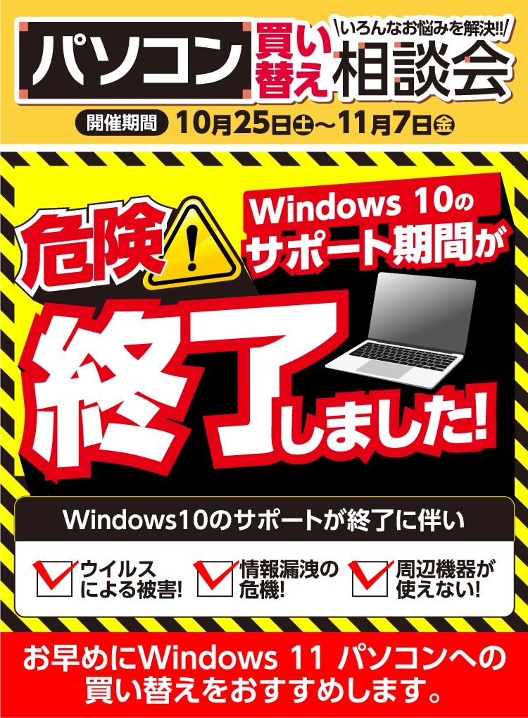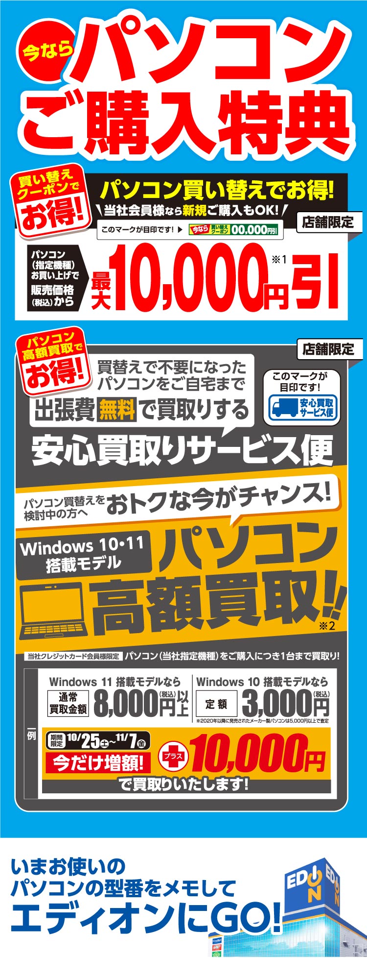 ※2:●ブラウン管モニターおよびブラウン管モニター 一体型のパソコンの買取りはいたしません。●完全動作可能で、OSリカバリディスク、電源付きの場合だけが対象。●動作・外観状態、商品に必要な付属品の有無によって買取価格は上記の金額を下回る場合がございます。●各特典はメーカー新品出荷時に搭載されたWindowsが対象となります。●新規パソコン1台のご購入につき、1台までの引取となります。買取りはエディオン買取センターが行います。買取りにかかる送料は「安心買取りサービス便」にて無料となりますが、買取り日が買取り申込み日より30日経過した場合は有料となる場合がございます。●お引き取り先はお客様の現在お住まいになられているご自宅に限ります。●本サービスは個人のお客様を対象とし、法人様は承れませんのでご了承ください。●ポイント買取の場合は、当社カード正会員様ご名義でのお申込が必要となります。配偶者カード会員様、家族会員様のご名義では承ることができませんので、予めご了承ください。お客様のご都合により買取りが成立しない場合は送料着払いにてお預かりした品を返送いたします。●詳しくは店頭スタッフまでお尋ねください。
