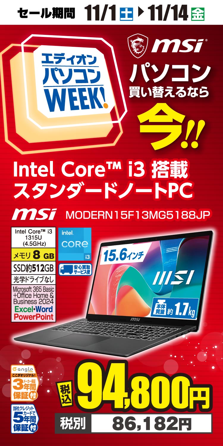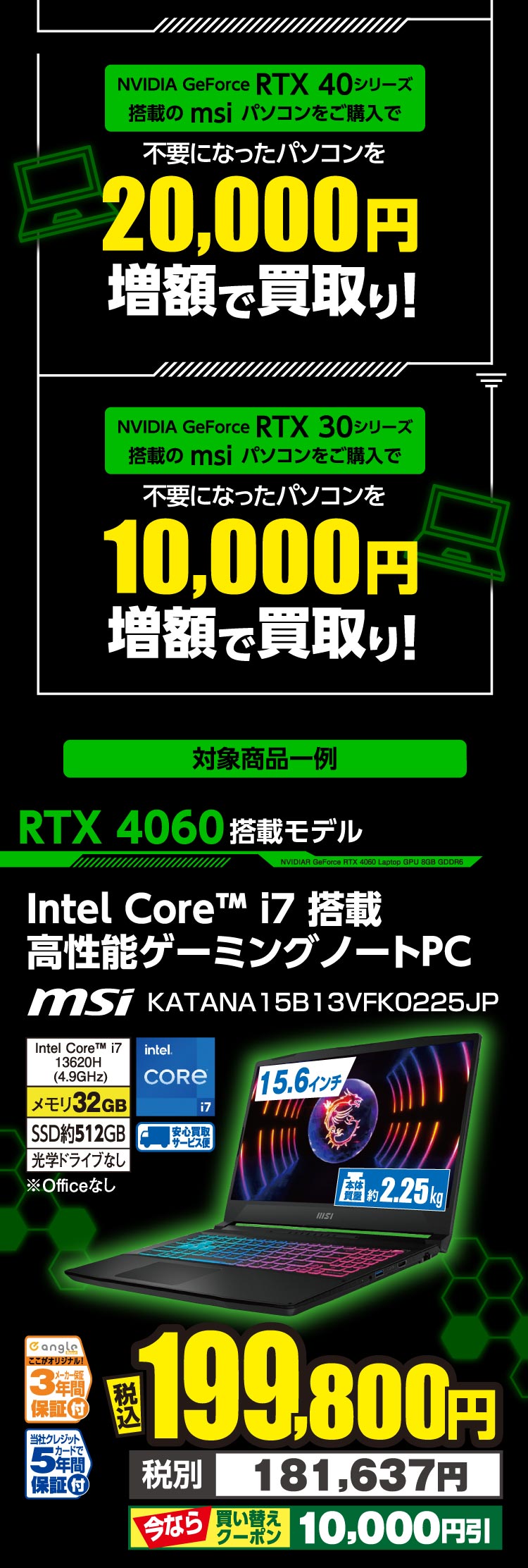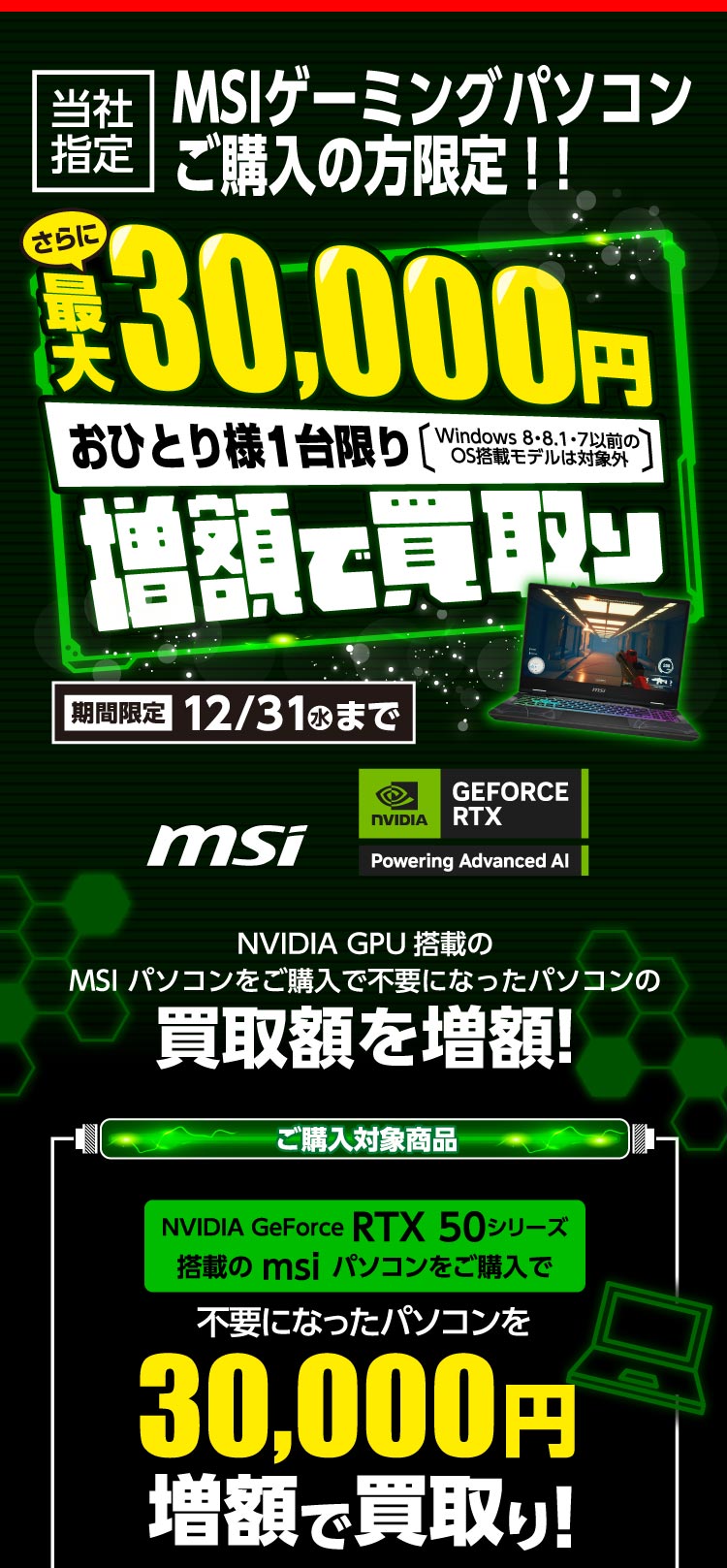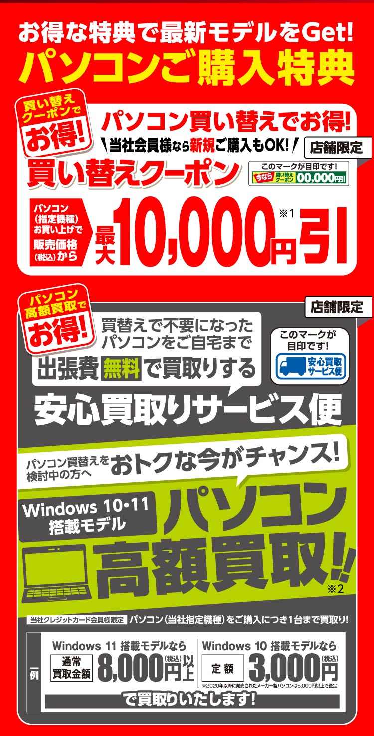 ※2:●ブラウン管モニターおよびブラウン管モニター 一体型のパソコンの買取りはいたしません。●完全動作可能で、OSリカバリディスク、電源付きの場合だけが対象。●動作・外観状態、商品に必要な付属品の有無によって買取価格は上記の金額を下回る場合がございます。●各特典はメーカー新品出荷時に搭載されたWindowsが対象となります。●新規パソコン1台のご購入に付き、1台までの引取となります。●買取りはエディオン買取センターが行います。●買取りにかかる送料は「安心買取りサービス便」にて無料となりますが、買取り日が買取り申込み日より30日経過した場合は有料となる場合がございます。●お引き取り先は身元確認書類記載のお客様がお住まいになられているご自宅に限ります。●本サービスは個人のお客様を対象とし、法人様は承れませんのでご了承ください。●ポイント買取の場合は、当社カード正会員様ご名義でのお申込が必要となります。配偶者カード会員様、家族会員様のご名義では承ることができませんので、予めご了承ください。●お客様のご都合により買取りが成立しない場合は送料着払いにてお預かりした品を返送いたします。●詳しくは店頭スタッフまでお尋ねください。