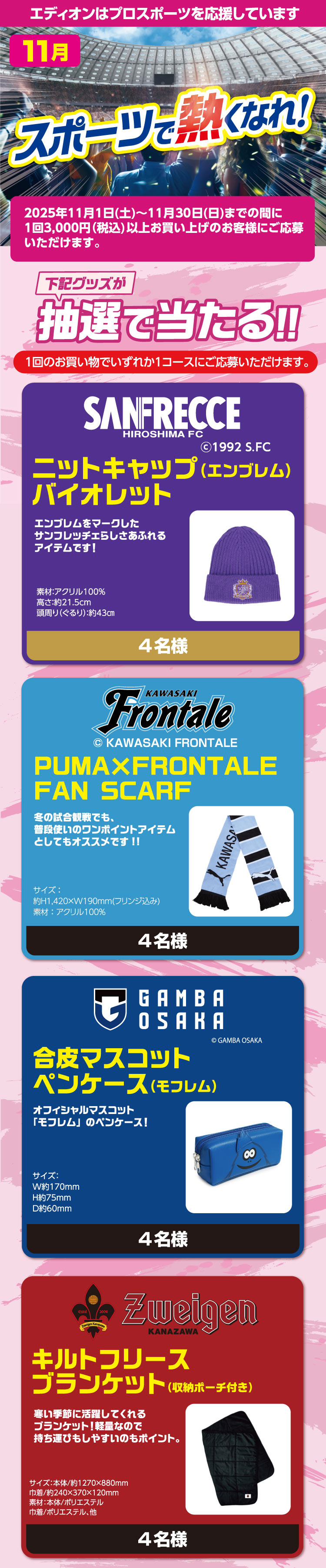 2025年11月1日(土)~11月30日(日)までの間に1回3,000円(税込)以上お買い上げのお客様にご応募いただけます。