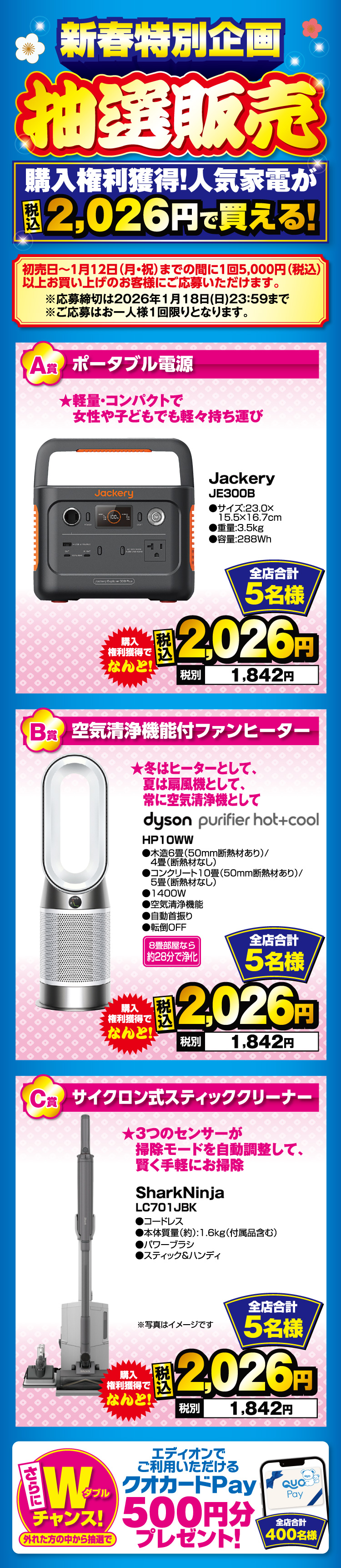 ※店頭で、1回の商品お買い上げ金額5,000円(税込)以上でエディオンアプリからご応募いただき、抽選により指定商品が買える権利が発生します。ご応募については、期間中お1人様1回限り。