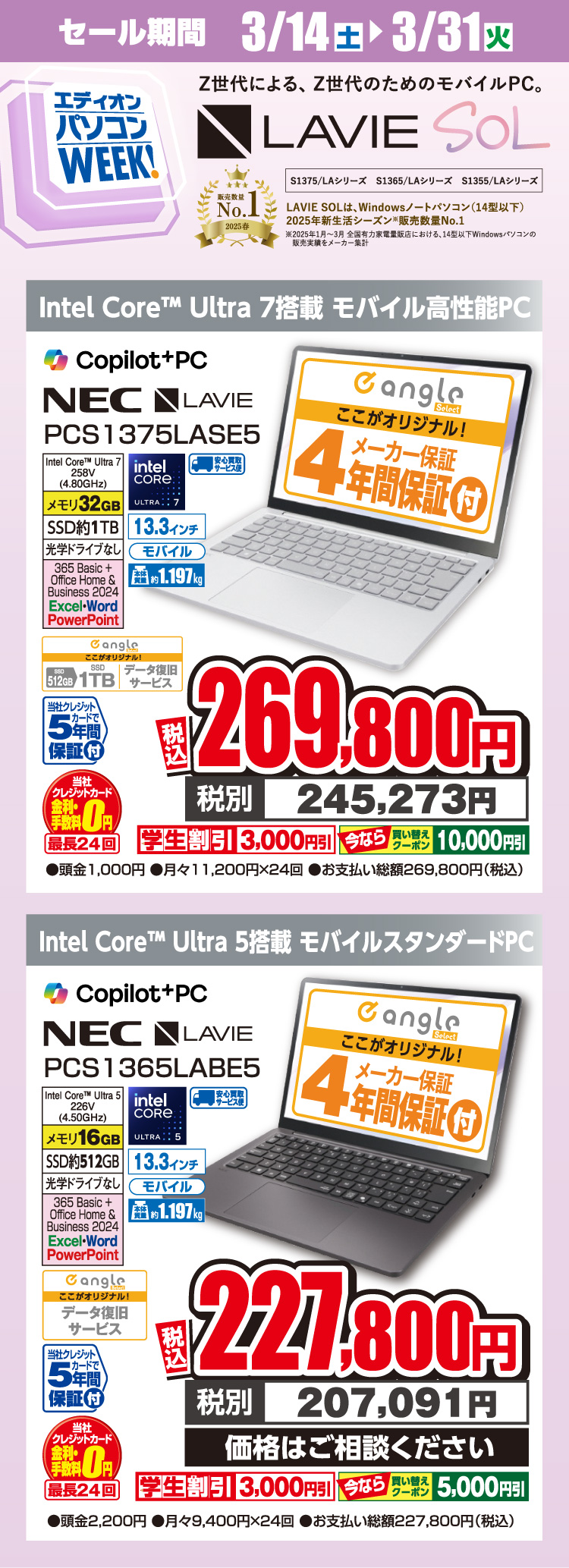 ※1:●当社指定機種が対象となります。●商談値引後の価格にはご利用いただけません。●現金との引き換えはできません。●配達時のご清算にはご利用できません。●エディオンネットショップからのご注文による店舗受取時にはご利用いただけません。●エディオンファミリーショップなどの一部店舗ではご利用いただけません。