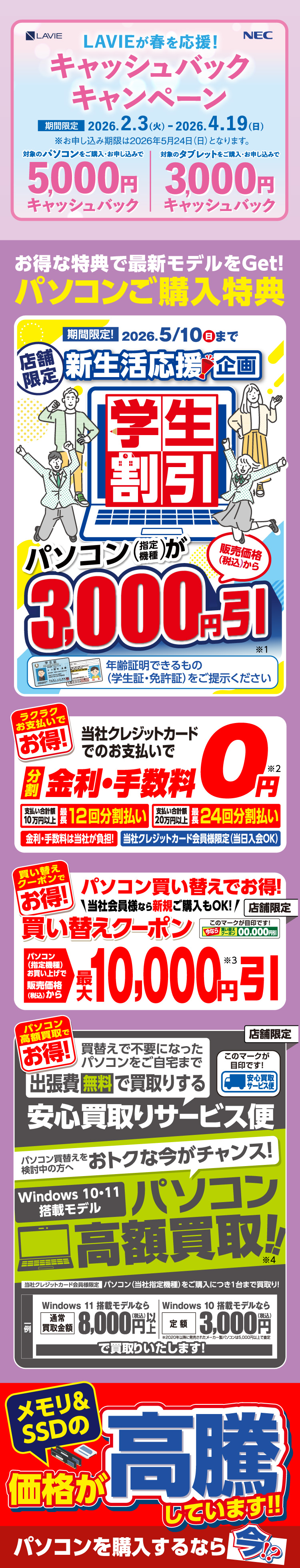 ※4:●ブラウン管モニターおよびブラウン管モニター 一体型のパソコンの買取りはいたしません。●完全動作可能で、OSリカバリディスク、電源付きの場合だけが対象。●動作・外観状態、商品に必要な付属品の有無によって買取価格は上記の金額を下回る場合がございます。●各特典はメーカー新品出荷時に搭載されたWindowsが対象となります。●新規パソコン1台のご購入に付き、1台までの引取となります。●買取りはエディオン買取センターが行います。●買取りにかかる送料は「安心買取りサービス便」にて無料となりますが、買取り日が買取り申込み日より30日経過した場合は有料となる場合がございます。●お引き取り先は身元確認書類記載のお客様がお住まいになられているご自宅に限ります。●本サービスは個人のお客様を対象とし、法人様は承れませんのでご了承ください。●ポイント買取の場合は、当社カード正会員様ご名義でのお申込が必要となります。配偶者カード会員様、家族会員様のご名義では承ることができませんので、予めご了承ください。●お客様のご都合により買取りが成立しない場合は送料着払いにてお預かりした品を返送いたします。●詳しくは店頭スタッフまでお尋ねください。