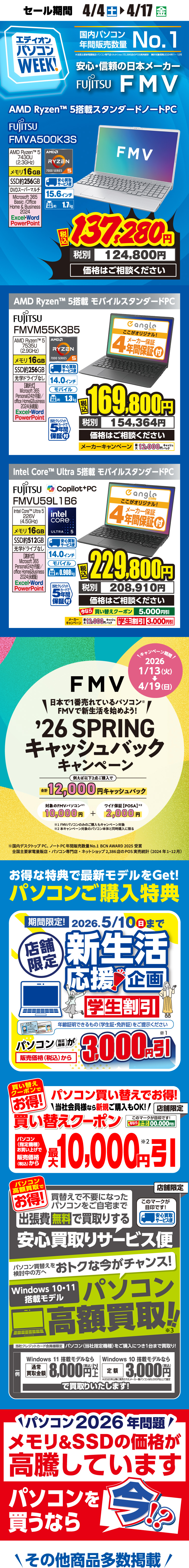 ※1:●当社指定機種が対象となります。●商談値引後の価格にはご利用頂けません。●現金との引き換えはできません。●配達時のご精算にはご利用できません。●エディオンネットショップからのご注文による店舗受取時にはご利用いただけません。●エディオンファミリーショップなどの一部店舗ではご利用いただけません。