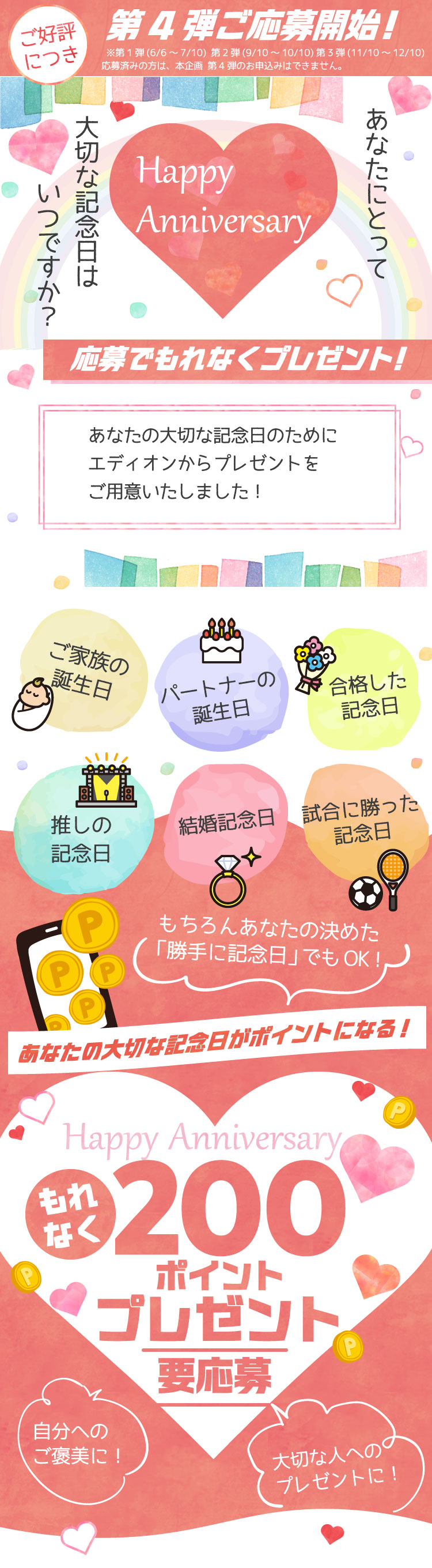 記念日の月に1か月間有効の200ポイントを進呈いたします。