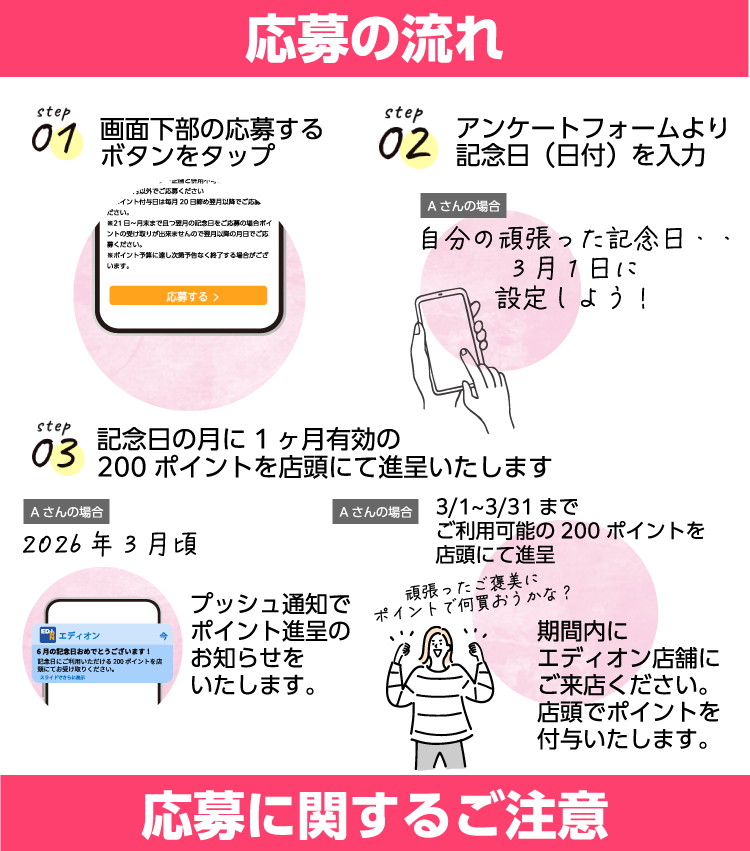 ※ポイントの受取り・ご利用は記念日の月初(1日)より可能となります。